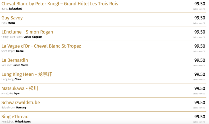 From New York to San Francisco, La Liste found the best fine-dining experiences nationwide. But the list extends beyond the United States — restaurants in France, Italy, and China also ranked highly on the list, and after analyzing thousands of publications, guidebooks, and online reviews, La Liste ranked the top restaurants with a score out of 100.