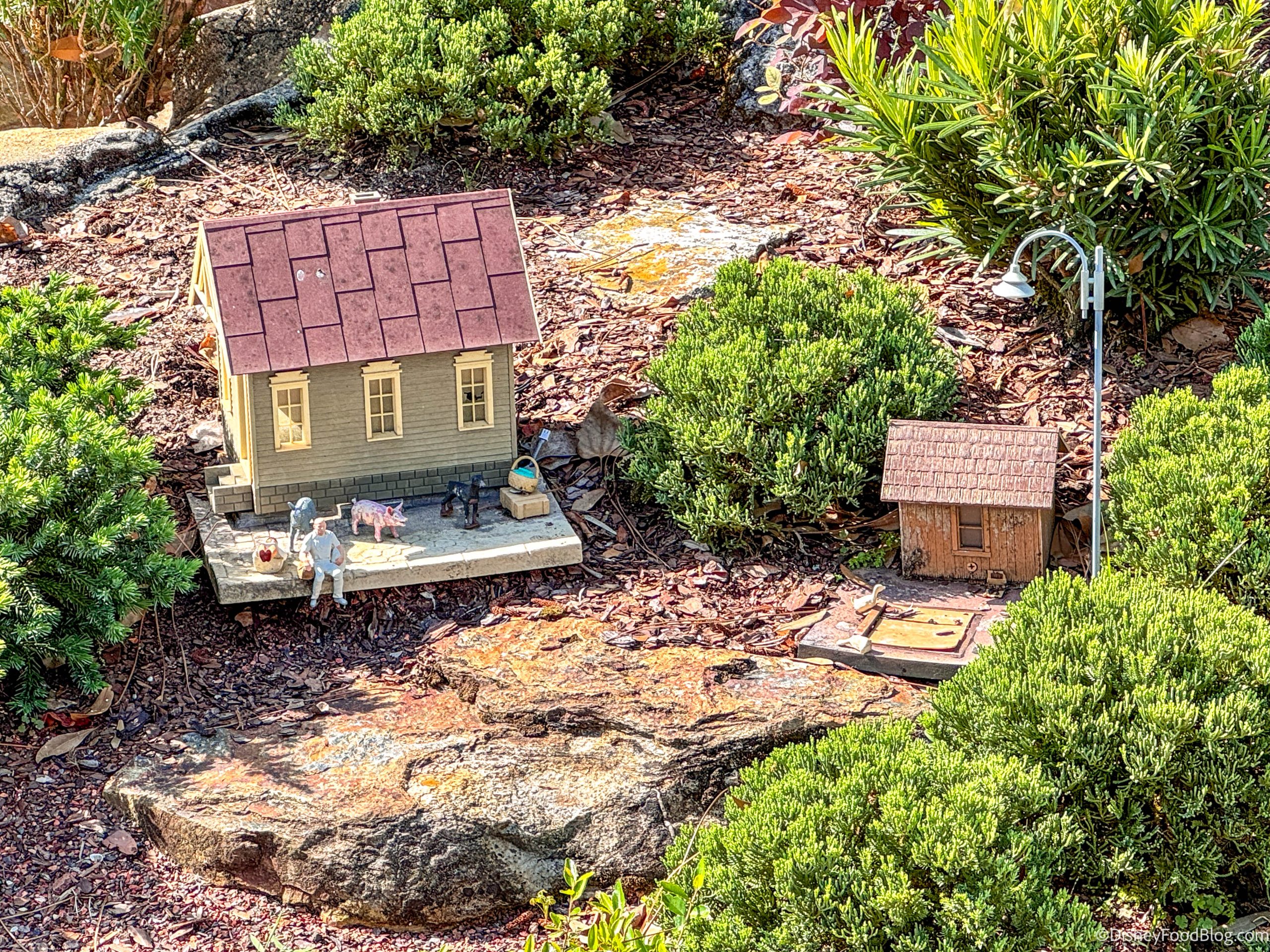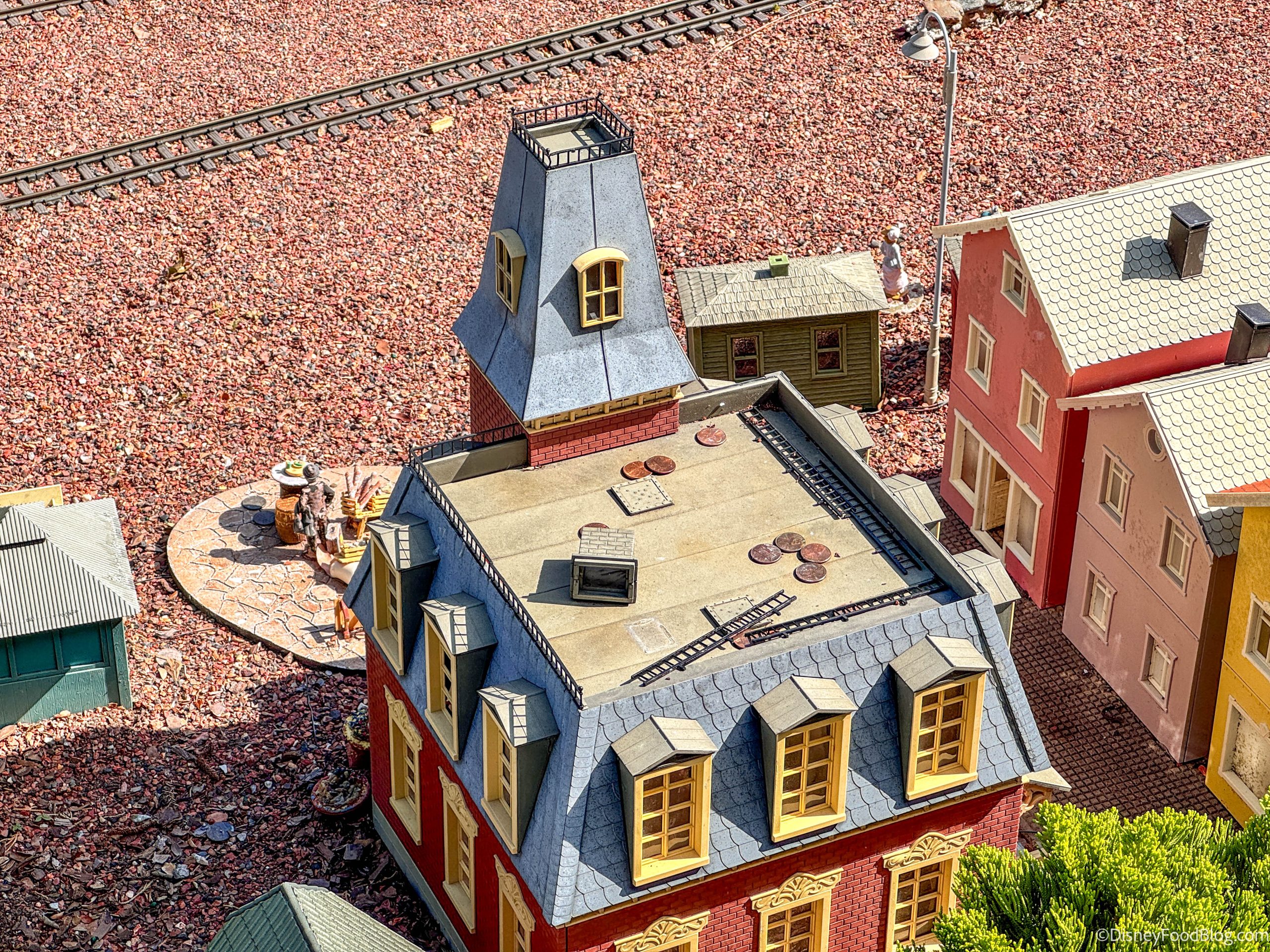 The anarchy within is mostly created by natural occurrences, like giant squirrels, wind, rain, and relatively godzilla-sized lizards who frequent the town; but we find it fun and entertaining to make up fictional stories about what COULD be happening. We are grateful to the folks who create and maintain this Tiny Train Town for Disney World, as it’s one of our favorite parts of EPCOT and always has been.