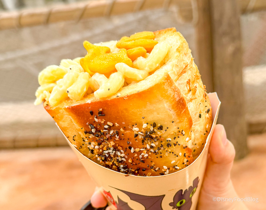Well, that has changed! You can also now grab the Goldfish Mac & Cheese Cone at Spit Fyre Grill, also in Isle of Berk. So if there’s a long line at Hooligan’s, just head on over to Spit Fyre Grill instead — it’s also available via Mobile Order there, unlike at Hooligan’s. So now getting that delicious snack is even easier! Note that the other two cones from Hooligan’s are also available at Spit Fyre Grill via Mobile Order: the PB&J Mac & Cheese Cone and the Dragon Fire Chicken Spire Mac & Cheese Cone.