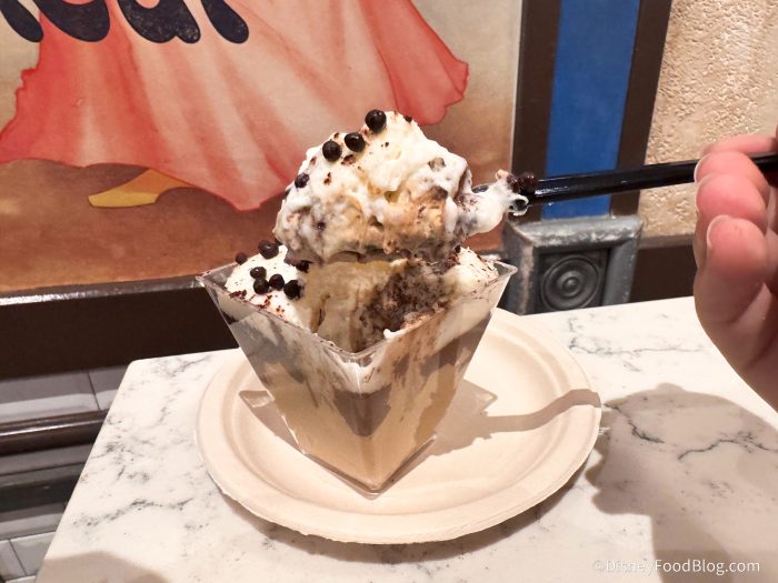 The mousse itself was airy and delicious, and while we enjoyed the little bits of chocolate cake, we found ourselves wishing for a thicker, more substantial layer of it in the middle. There’s definitely more whipped cream than cake, but the crispy pearls on top added a great crunch that made each bite feel a little more special. We also appreciated that while the coffee flavor was definitely present, it wasn’t overwhelming — it struck a nice balance that even non-coffee drinkers could enjoy.
