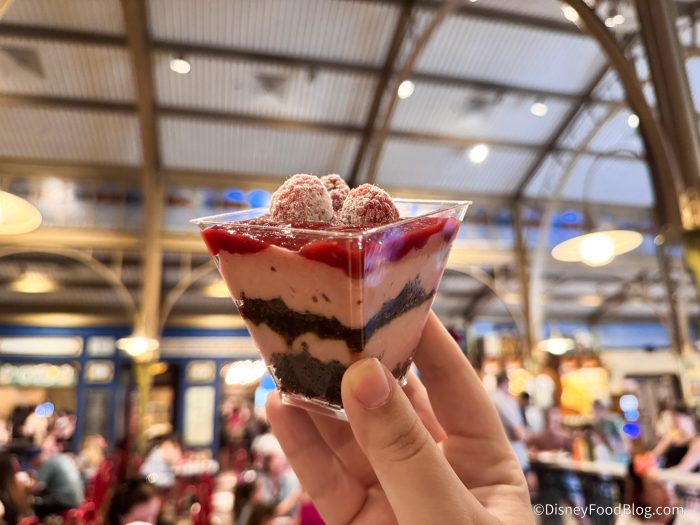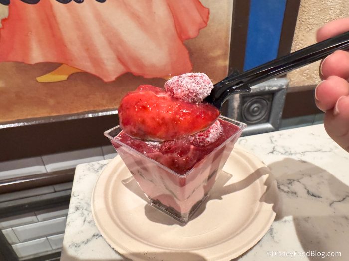 The filling, which was labeled as mousse, actually felt more like a pudding to us. We found that even after just a couple of bites, the sugar started to feel like a bit much, so it’s probably a dessert best shared. That said, if you love raspberries and don’t mind a dessert that leans ultra-sweet, this one was still a fun treat to try. It just wasn’t our personal favorite.