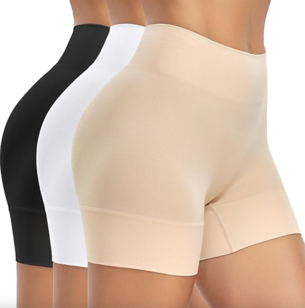 I packed a couple of options. I wanted a few pairs of short (I like the three-inch) biker shorts and a bodysuit to wear under my dresses. This isn’t my first rodeo, so I had a stash of little shorts perfect for this scenario. The shorts can’t be too long; otherwise, they’ll peek out past the hem of my dresses. If you’re looking for recommendations, you can pick up a multi-pack like this on Amazon.
