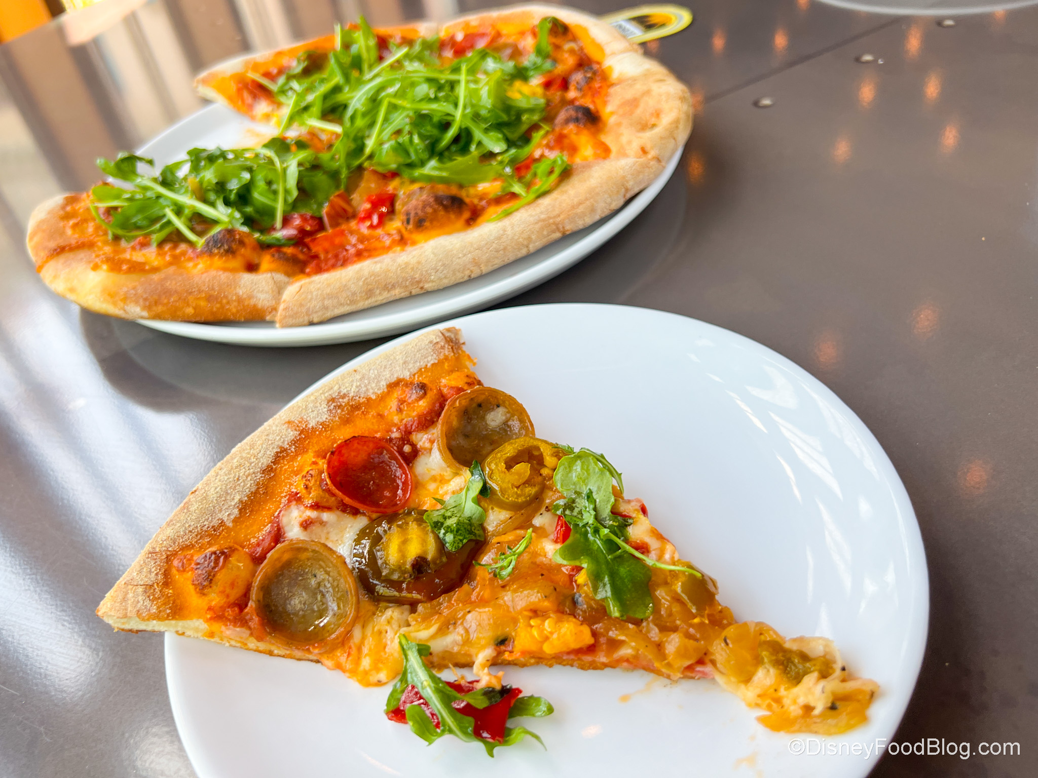 This pizza was SO nice. It’s spicy, sure, but there’s a lot of flavor here, more so than heat. We will admit that it was a little veggie-heavy for us, but that’s a personal opinion. Your veggie-hating kids are going to turn their noses up at it. However, this is one of our favorite things we’ve had at Epic Universe so far, so that’s saying a lot!