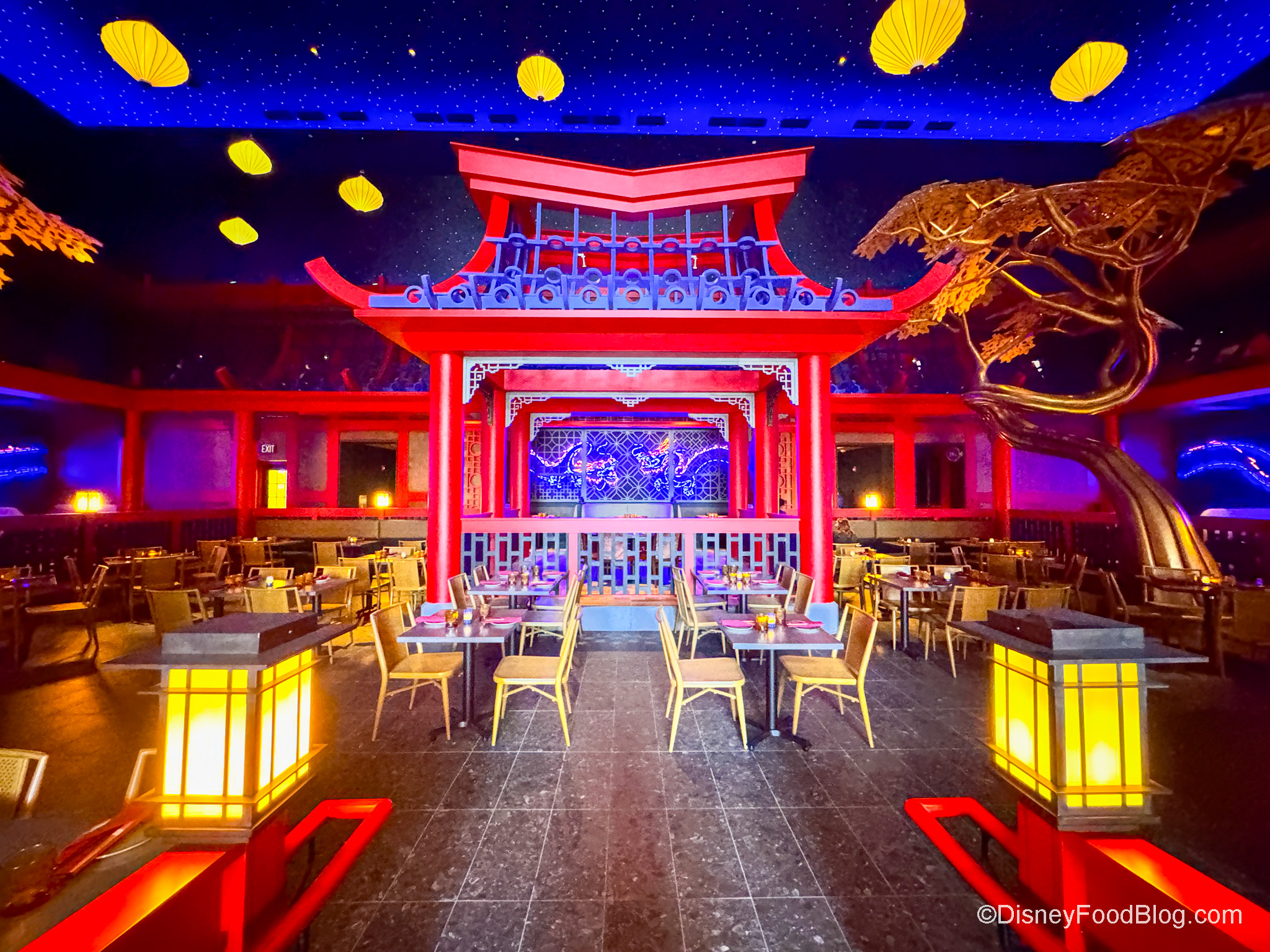 The theme is a bustling Asian courtyard, so you’ll find a massive “tree” overhead in part of the dining area.
