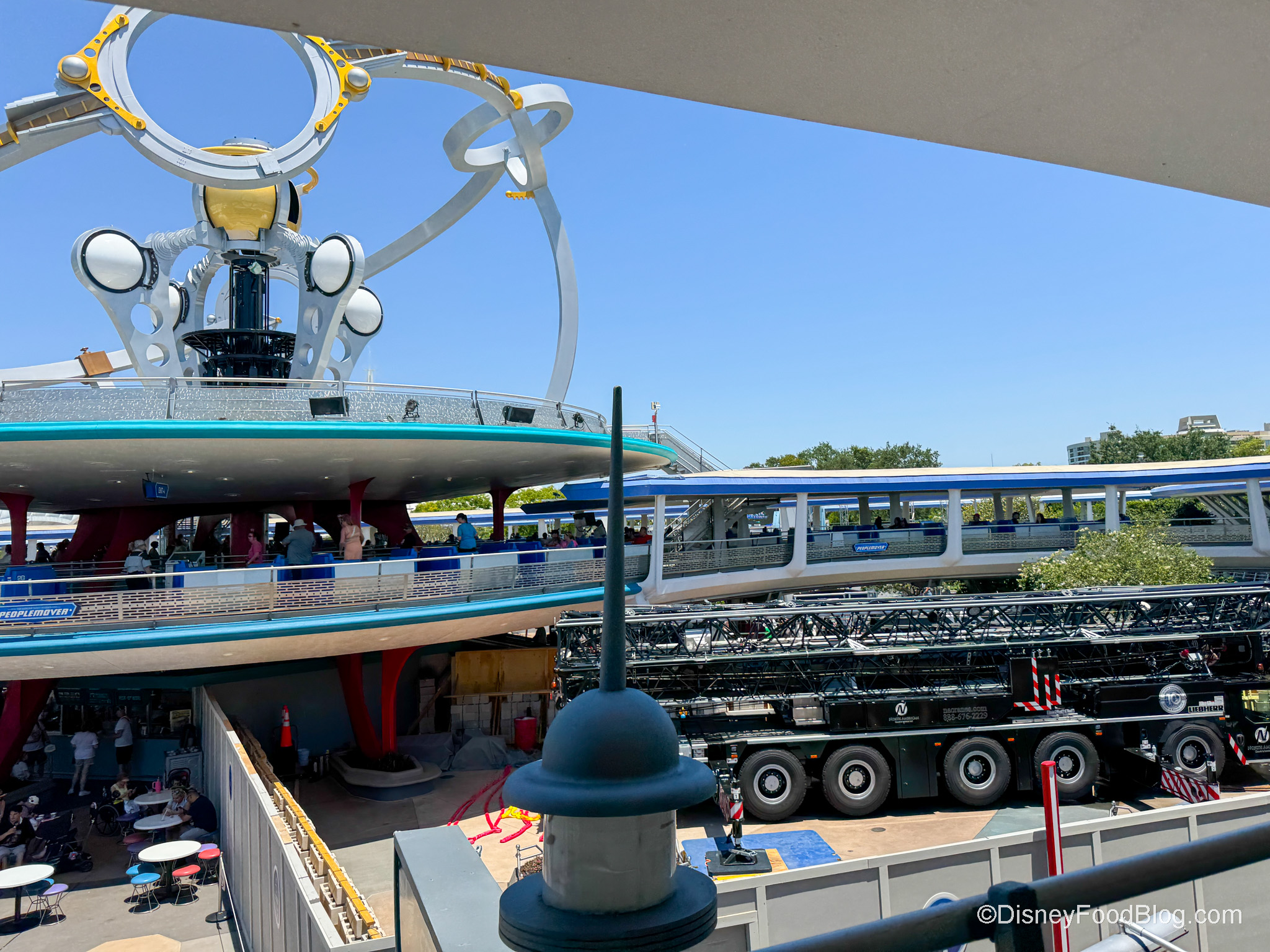 However, on a recent visit to Magic Kingdom, we noticed that the ride was being reassembled. Some of the ride’s details in the center are being added back to the main ride structure. Here’s a view of the ride from the PeopleMover.