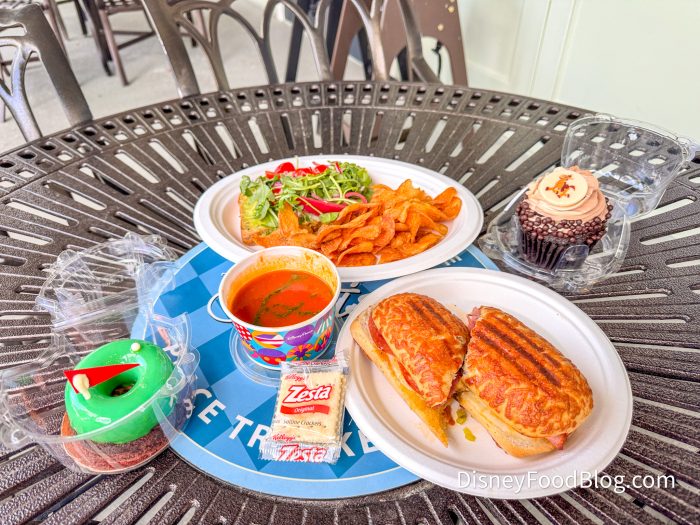 First up, we grabbed the Avocado Toast with Chips for $10.99! This is made with avocado, cherry tomatoes, radish, Pickled red onions, arugula, and “aïoli” on toasted sunflower bread, and it’s served with a side of Saratoga Chips. (Just noting, Disney has aïoli in quotations on its website but doesn’t detail why.)
