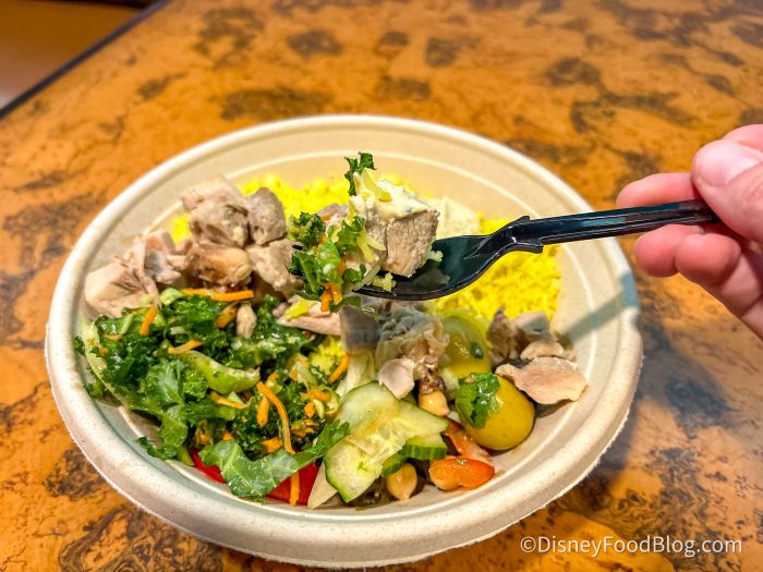 The rice was seasoned well and had flavors of cumin and cardamom. The kale slaw had a sweet dressing on it that helped cut the bitterness of the kale. You will also find a tomato and cucumber salad that has a light vinegary taste to it, as well as a chickpea salad with olives. But one of our favorite parts of the bowl was the chermoula sour cream. It was creamy and full of flavor. We tasted cilantro and parsley, and it really helped bring the whole bowl together.