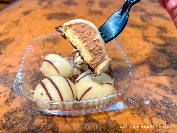 Finally, we couldn’t head to Animal Kingdom Lodge without grabbing one of our favorites: Zebra Domes. You will also find these at the buffet at Boma, but if you don’t want to commit to a buffet, you can also grab them at The Mara. It costs $4.59 and they are chocolate mousse baked with Amarula cream liquor-coated white chocolate drizzled with chocolate stripes and chocolate shavings.
