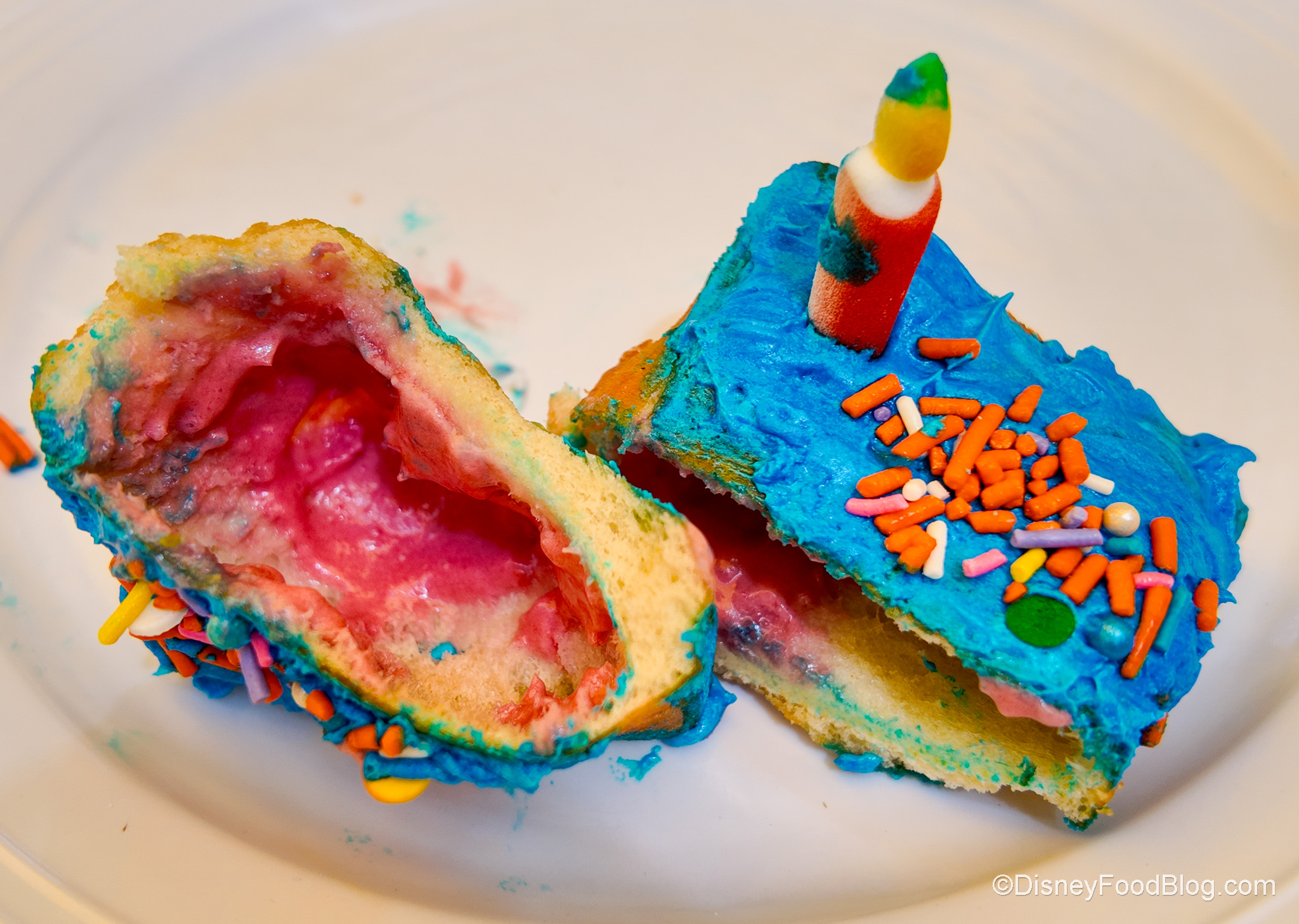 This beignet is pretty much on par with the previous ones we’ve had here, and that’s not saying much. First, it tastes artificial. Second, it’s not even a traditional beignet (you’re really letting Tiana down here, Disney). The blue frosting turned us into a Smurf, and the strawberry filling tastes fake. There’s also very little filling, and LOOK at the inside of this thing. Where’s the traditional beignet fluffiness? It’s just not there. This is not a real beignet, and you can’t convince us otherwise.