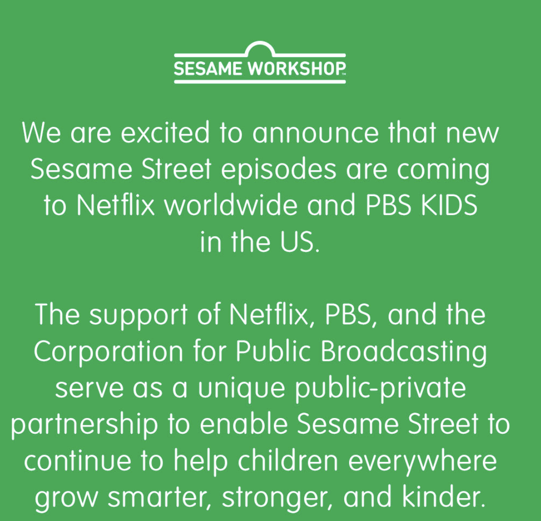 “We are excited to announce that all new @sesamestreet episodes are coming to Netflix worldwide along with library episodes, and new episodes will also release the same day on PBS Stations and @pbskids platforms in the US, preserving a 50+ year relationship. The support of @netflix, @pbs, and the Corporation for Public Broadcasting serve as a unique public-private partnership to enable Sesame Street to continue to help children everywhere grow smarter, stronger, and kinder.“