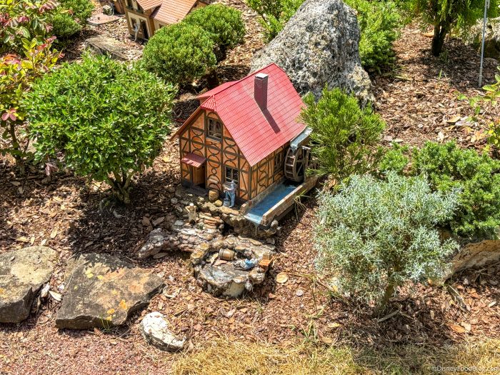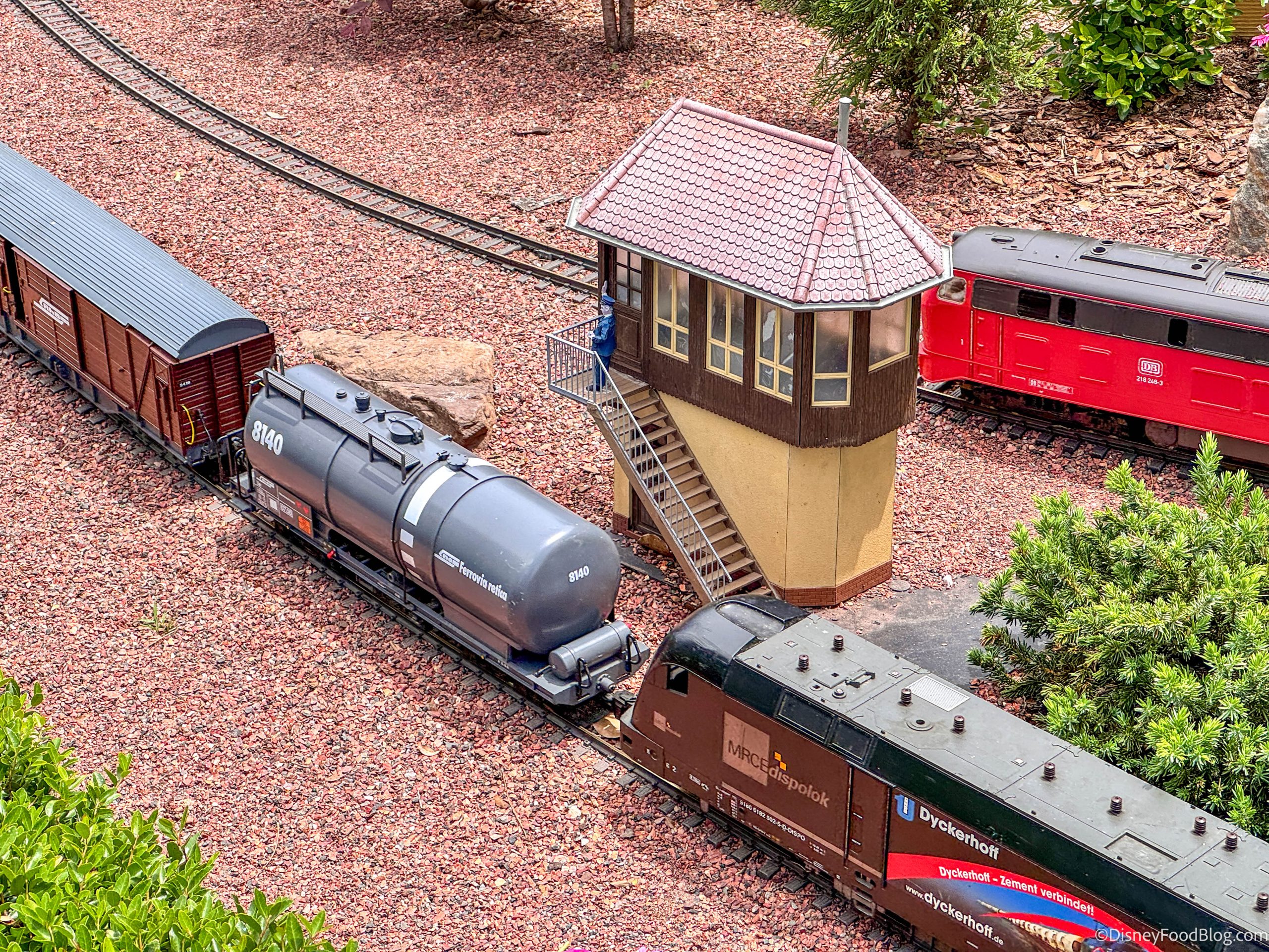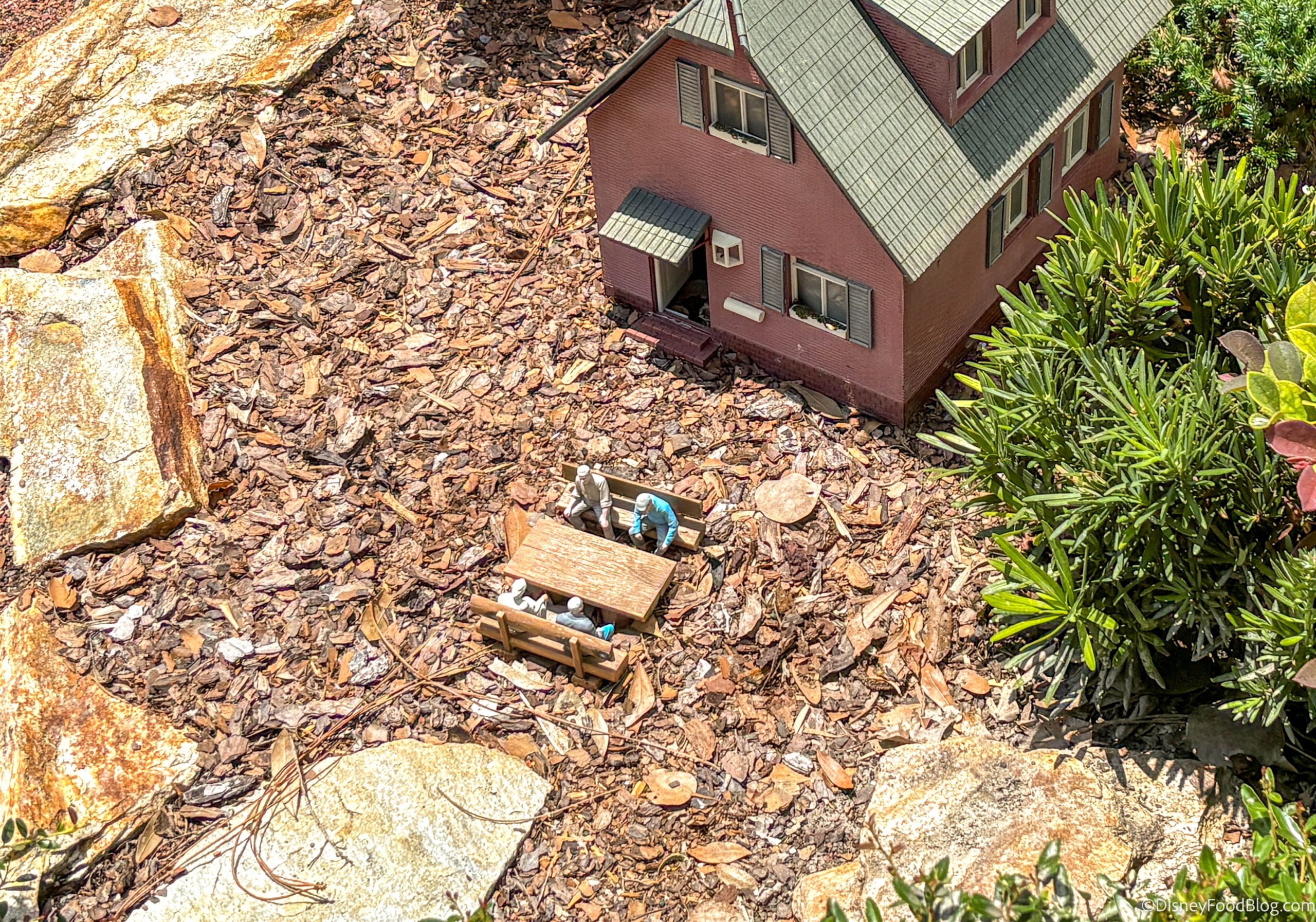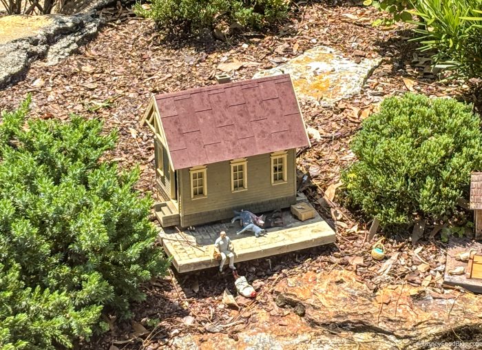The anarchy within is mostly created by natural occurrences, like giant squirrels, wind, rain, and relatively godzilla-sized lizards who frequent the town; but we find it fun and entertaining to make up fictional stories about what COULD be happening. We are grateful to the folks who create and maintain this Tiny Train Town for Disney World, as it’s one of our favorite parts of EPCOT and always has been.