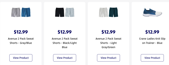 ALDI also has some shorts for you. Technically, the shorts are a little over $6 each, since the shorts come in packs of two! There are a few color options — gray and blue, black and light blue, and gray and green. We also have another pair of knit slip-on trainers for the ladies, this pair coming in blue.