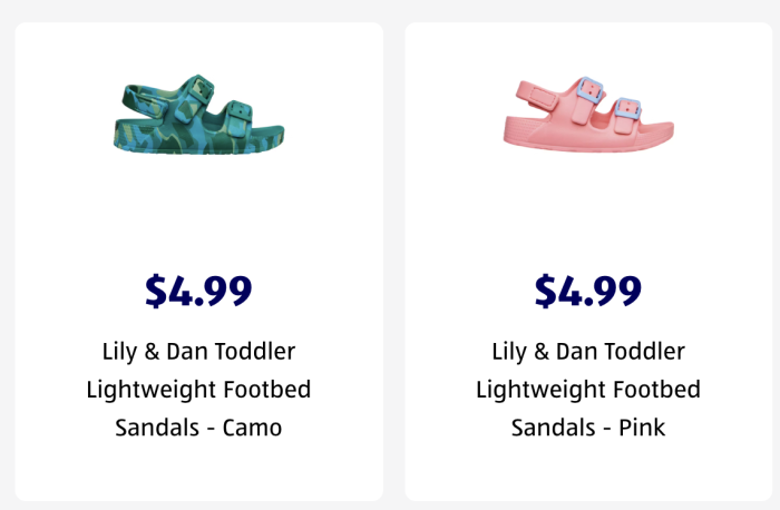 ALDI isn’t leaving your little ones out; they have sandals for toddlers as well. They offer the same comfort and lightweight, and are only $5! The little cuties get some different color choices — pink and a cool mix of green shades to create a camo design.