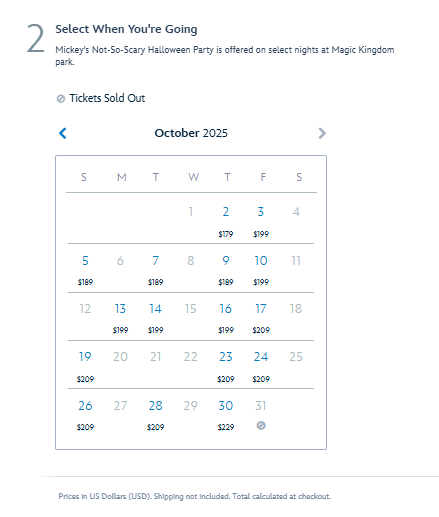 It comes as no surprise that fans want to get out to the Magic Kingdom on Halloween night. The 31st is typically the first night to sell out when tickets go on sale, combined with the fact that it lands on a Friday this year, and everyone had to hop on the tickets fast! Mickey’s Not-So-Scary Halloween Party begins on August 15th and will happen on select nights through October 31st. Pricing ranges from $119 all the way to $229 — $229 being the price on Halloween Eve and day.