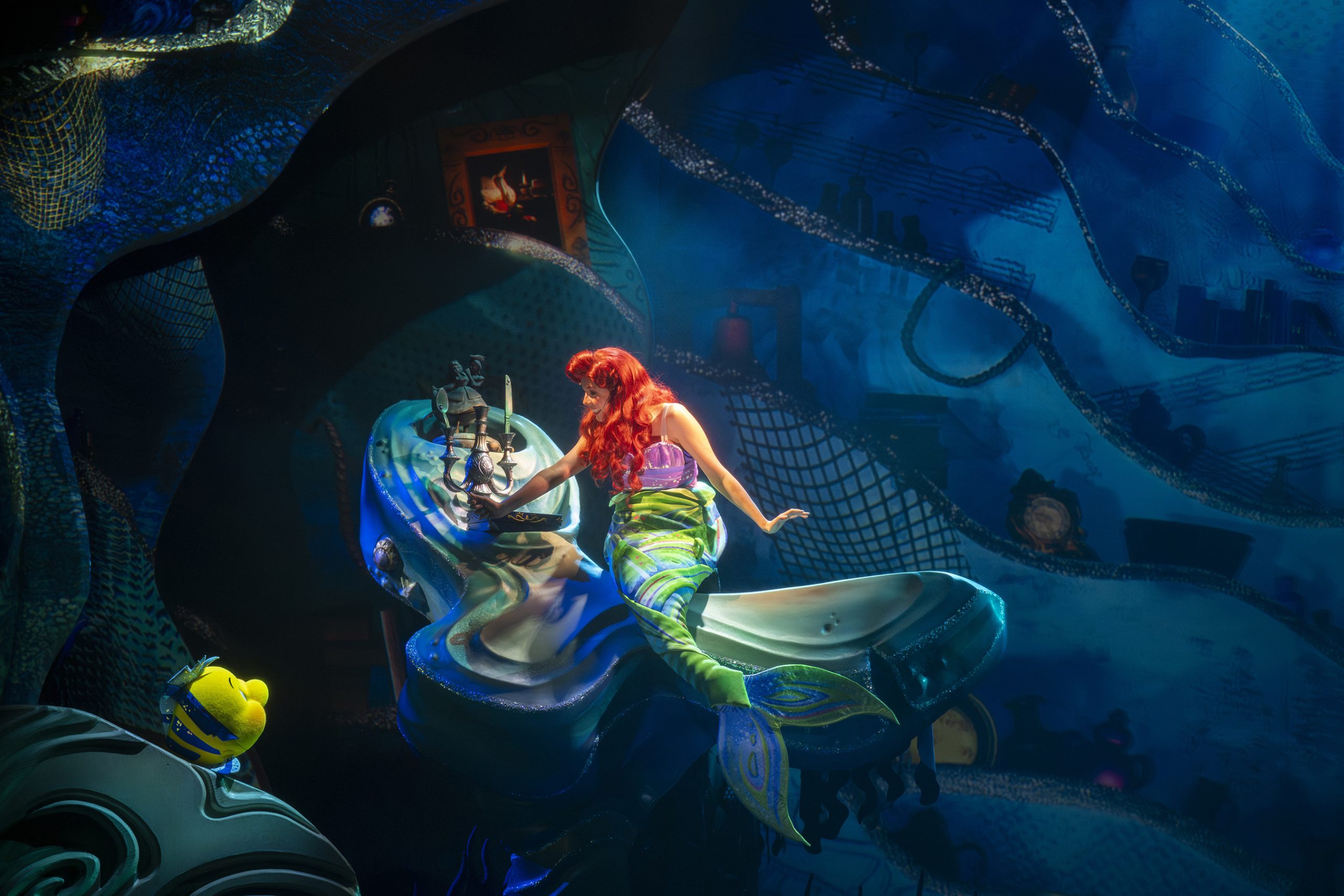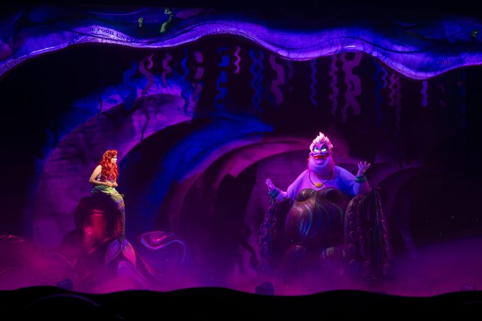 The Little Mermaid — A Musical Adventure will be a retelling of Ariel’s story from the animated The Little Mermaid movie. Expect to see a lot of familiar faces, including Ariel, Prince Eric, Max, Flounder, Sebastian, Ursula, and more. Disney even recently confirmed that Ariel’s sisters will also appear in the show. Now, let’s take a look at some of the photos Disney just dropped for the show. So here’s the “Under The Sea” number: