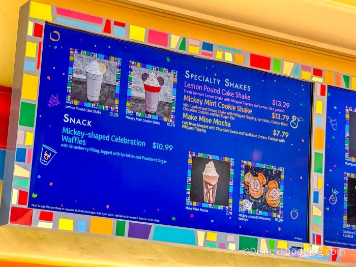We picked up Mickey-shaped Confetti Waffles with strawberry whipped cream, topped with sprinkles and powdered sugar for $10.99, and we are in the birthday spirit!