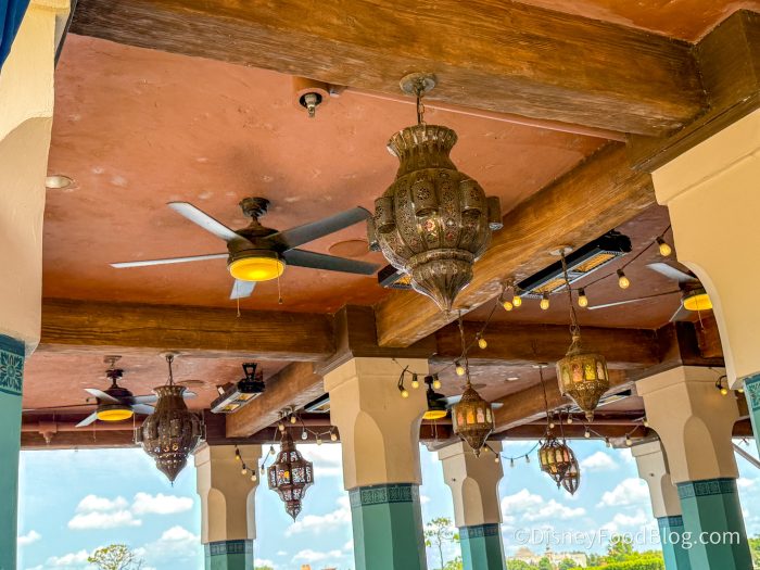 The covered patio has beautiful lamps and fans along the ceiling to help you stay cool. There are even some additional umbrellas to help with that brutal Florida heat, but don’t worry, there are some tables inside as well. The deep teals take us straight to Morocco!