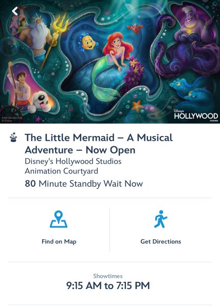 What about this new Little Mermaid show? During the first day of operations, we saw the standby queue get as high as 80 minutes. That’s pretty long for a show that’s about 20 minutes long! Again, we won’t be able to pick it as a Lightning Lane for about another month so the crowds might be drastically lower by then.