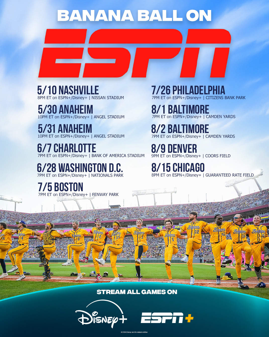 After the Savannah Bananas have spent the day at Disneyland, they will be heading over to Angel Stadium in Anaheim, California to play games on May 30th and May 31st. If you aren’t able to catch the games, have no fear! These games, as well as nine others, will be streaming on Disney+.