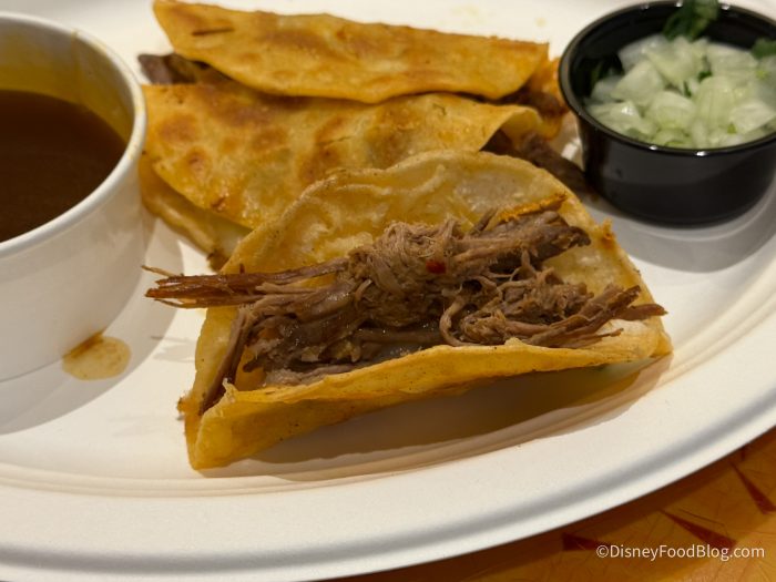 The birria beef is served inside the melted monterrey jack cheese (which almost tastes like mozzarella), and on their own, they’re already good. But, the longer you let them sit and cool, the more of a chance you take with the grease cooling and sticking to the meat, making it a little tougher to bite into.