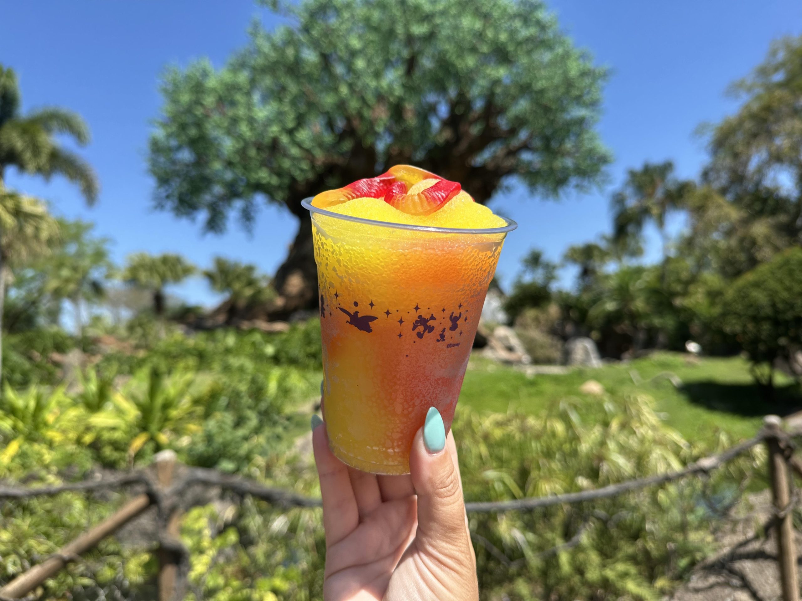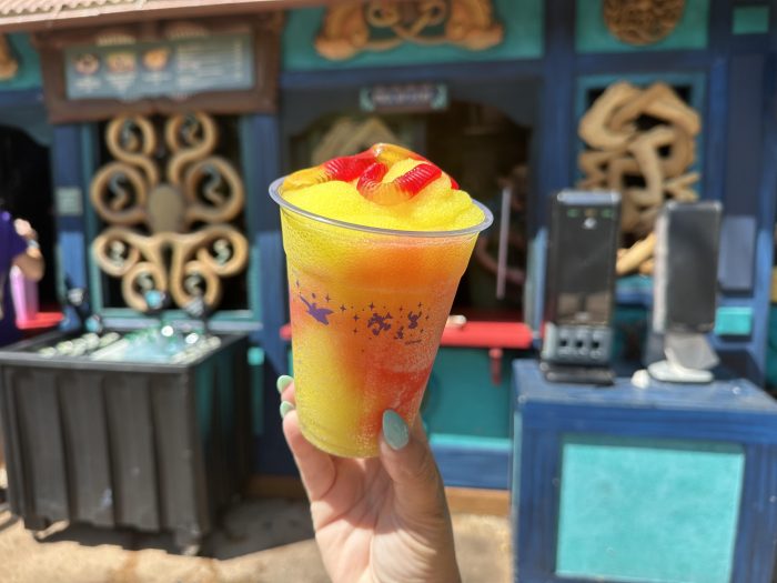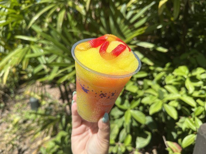 The drink is a mango-flavored slushy with grenadine and two gummy candies, and it’s so cute!