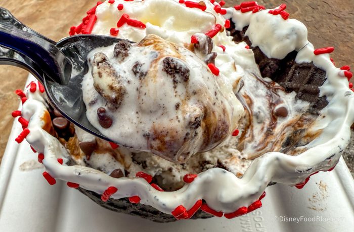 This isn’t exactly the most innovative or exciting sundae we’ve ever seen, but it’s a crowd pleaser with all our favorite things. Chocolate? YUM! Cookie pieces? YES! Sprinkles? Of COURSE! If you’re looking for a fun treat to help you cool off in Disney World, give this a try.