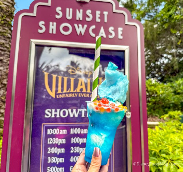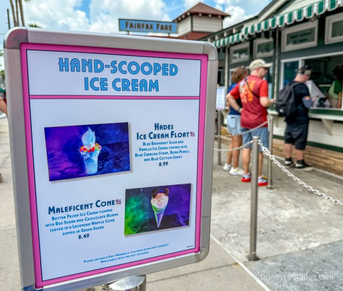 We stopped by Hollywood Scoops for a little ice cream treat in Disney’s Hollywood Studios! There are three new treats here, but during our visit, Maleficent was very angry to find that her treat was being sold alongside the likes of Hades and Cruella de Vil, so she pulled her participation (for now). Hopefully, after she cools down, we’ll see that new Maleficent Cone on the menu.