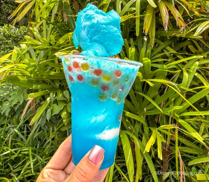 Up next is a treat ANYONE can purchase — the Hades Ice Cream Float for $8.99. This one is a blue raspberry slush and vanilla ice cream topped with blue curacao syrup, boba pearls, and blue cotton candy. Literally every child under the age of 16 saw this on the menu and begged their parents to purchase the float. We get it — it’s EPIC!