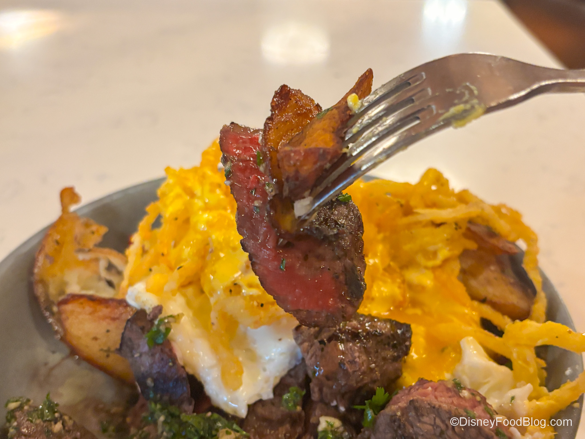 The potatoes are lightly seasoned with a nice golden exterior — they’re soft on the inside and are the perfect complement to the steak. The crispy onions add a nice crunchiness.