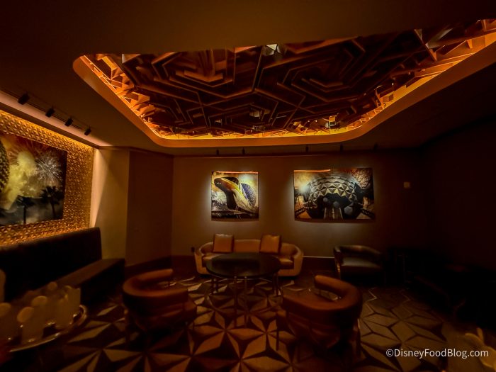 This space certainly does remind us of Spaceship Earth, so we say it gets 5/5 stars for that decoration choice! The main seating area of this space has plenty of comfortable chairs and booths, and it pairs fantastically with all the gorgeous lighting.