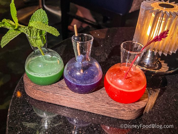 This is a drink trio, each featuring a vanilla bean-infused Golden Eagle vodka with distinct flavors, including Giffard banana liqueur, pineapple juice, lemon juice, honey, coconut syrup, and edible glitters. Broken Spell Lounge has tie-ins to Sleeping Beauty, and it looks like each drink represents Flora, Fauna, and Merryweather.