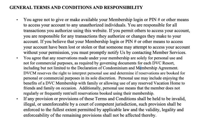 The document goes on to read, “Personal use may include enjoying the benefits of a DVC Membership with family or allowing use of any reserved Vacation Home to friends and family on occasion. Additionally, personal use means that the member does not regularly or frequently rent/sell reservations booked using their membership.”