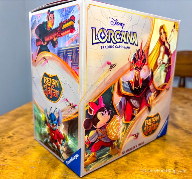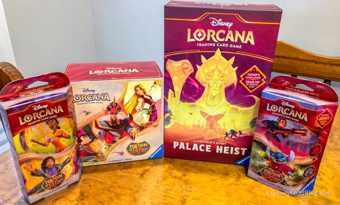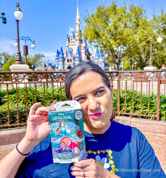 You might not know this about me, but my husband and I have been HUGE Lorcana fans ever since he bought the Gateway (or starter) Box for me last year on my birthday. It’s now got us in a chokehold — so much so that during the LAST Lorcana release for Archazia’s Island, we opened up Single Player Decks on the Hub Grass of Magic Kingdom. (GREAT memory, by the way.)
