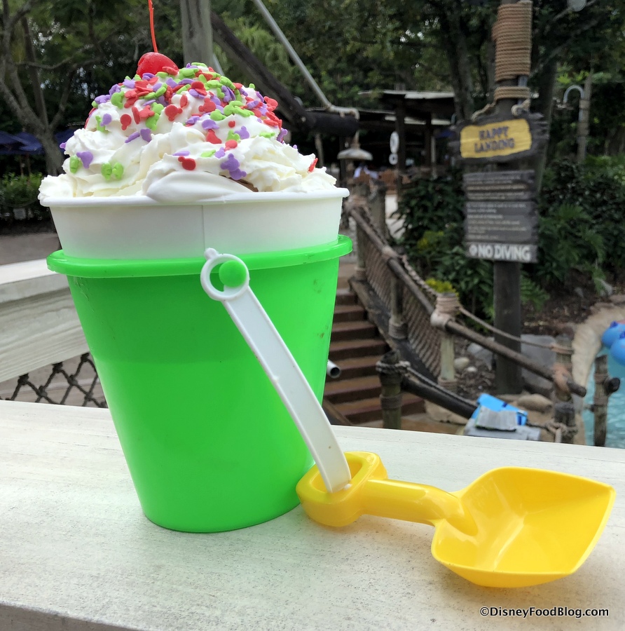 There is a bit of a theme going on here, apparently, we just really like eating sundaes out of unique things! The Sand Pail Sundae is another one of our favorites from Typhoon Lagoon. It is BIG and we highly recommend sharing it with at least one other person. It is served in a fun souvenir sand pail, and the spoon is a shovel! The pail changes occasionally; for example, they even had a special pail for the 50th anniversary of Disney World.