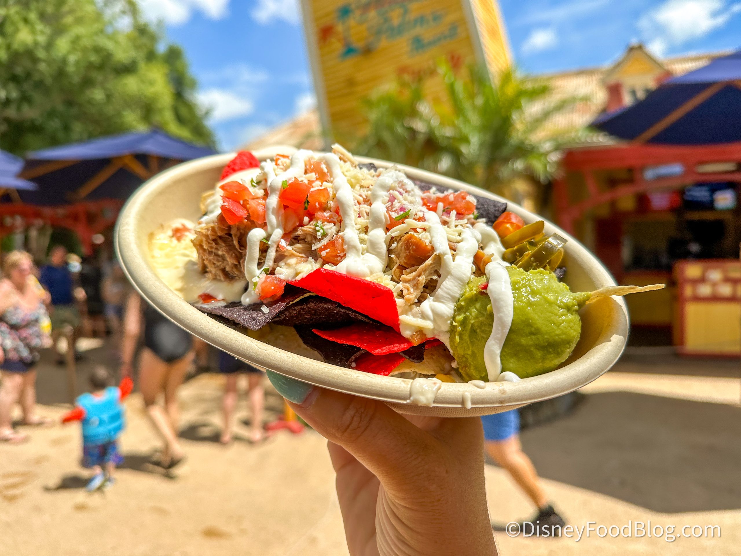 These nachos contain roasted pork over nacho chips with elote cheese sauce, guacamole, sour cream, roasted corn, jalapeños, and Pico de Gallo. They are loaded with fresh toppings and perfect for a quick bite during your day at Typhoon Lagoon.