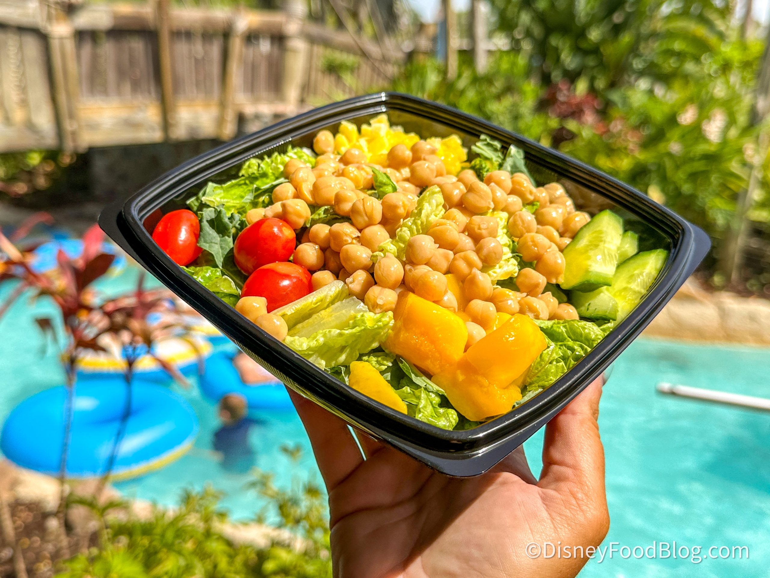 The ingredients are super fresh, and even though it is a salad, we found it to be very filling while not making you sluggish. It is perfect to nosh on in between slides or laps in the lazy river. Plus, we could really taste the tropical flavors in this salad!
