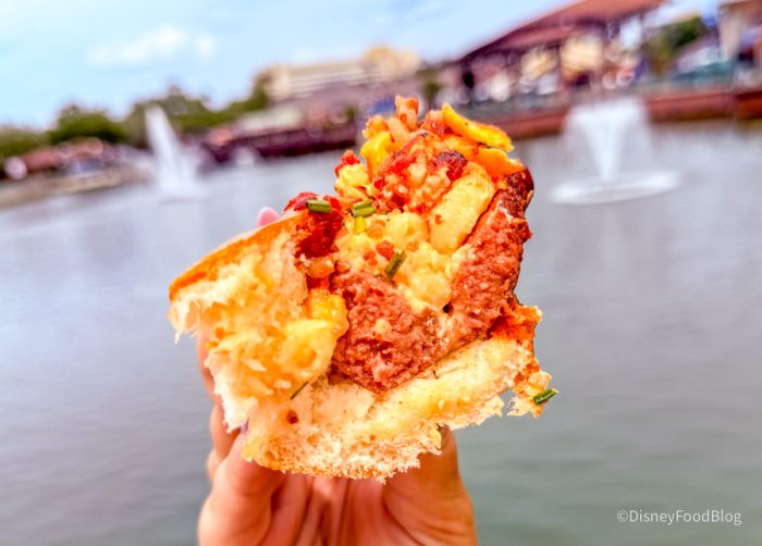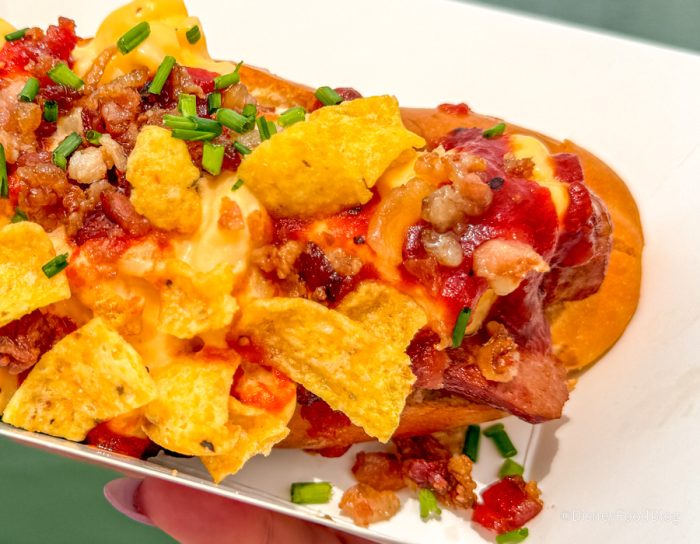 OK, the perfect hot dog does exist, and it’s here at Disney Springs. This Bacon Mac & Cheese Dog was literally everything we thought it would be and then some. It’s made with mac and cheese, which is creamy but not overly cheesy to where it’s gonna make it gooey and melty. The bun for the hot dog is slightly toasted and buttered on the sides, which we really liked because it had that toasty, buttery taste to it. The hot dog itself is cut in half, which we appreciated because it wasn’t so hard to take a bite, and it allowed for kind of all the condiments sitting on top of it to have a place to sit, versus trailing off the sides.