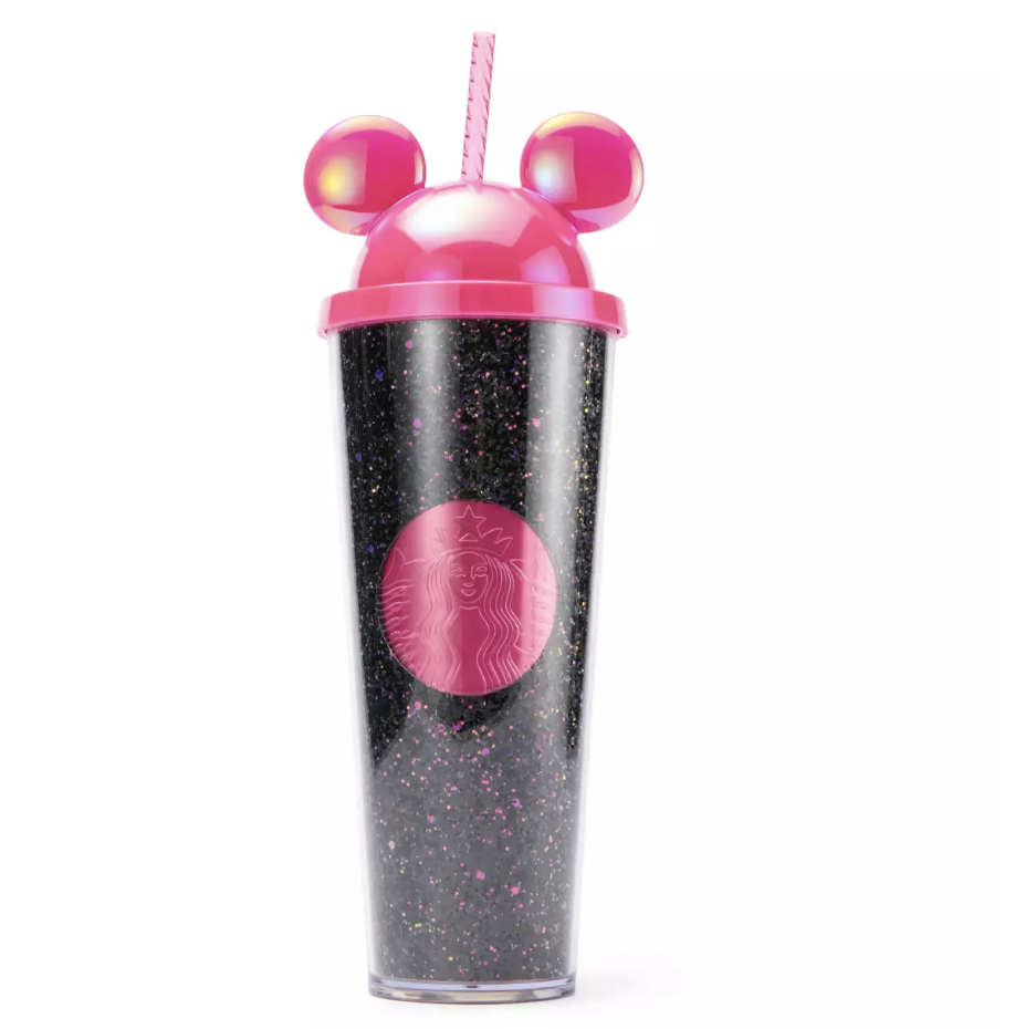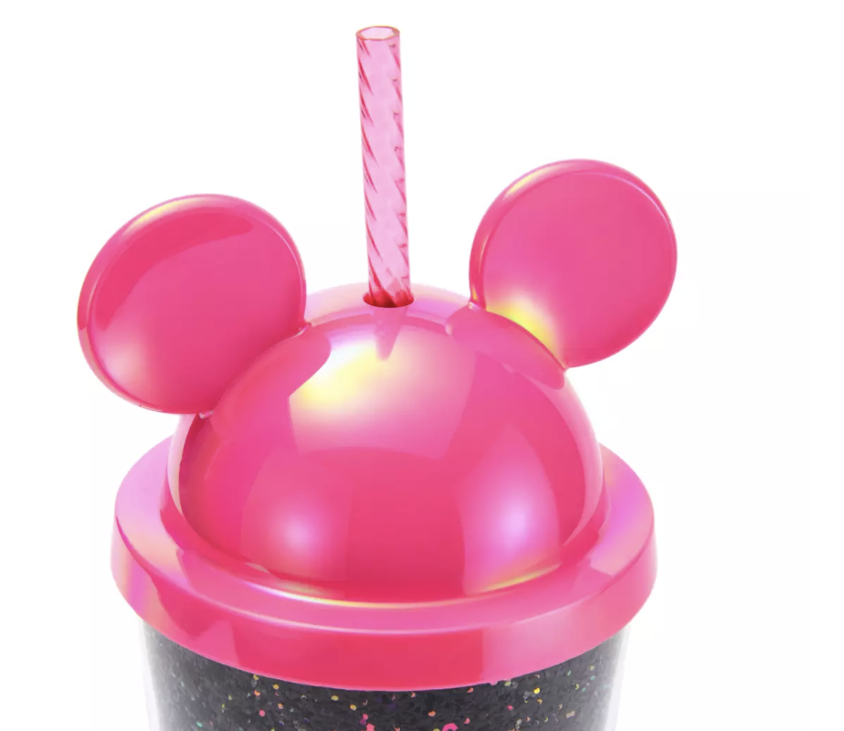 It’s sparkly all over and features a rainbow colored logo on the side. The top of the cup is pink and shaped like a Mickey hat, which we can’t get enough of.