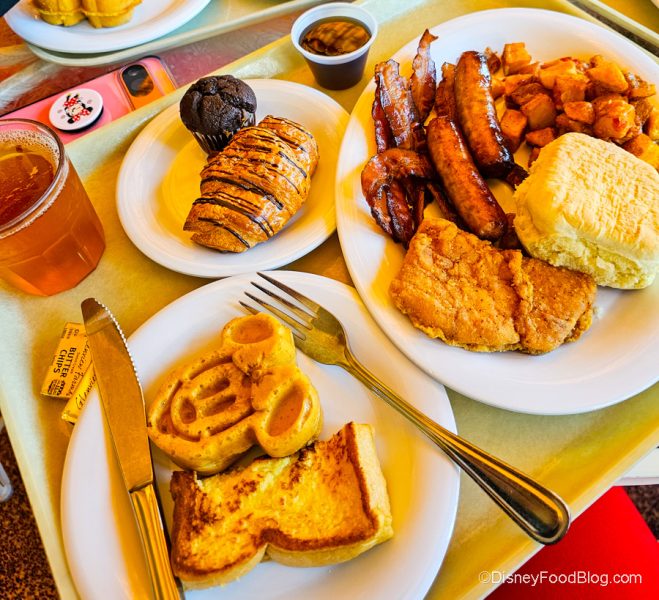 The food was pretty standard for a Disney breakfast buffet. You’ve got your usual options like eggs, bacon, sausage, pastries, French toast, and some of the best breakfast potatoes I’ve ever had in my life (I went back for seconds). However, instead of Mickey waffles, you get Minnie waffles, and that was such a cute touch.