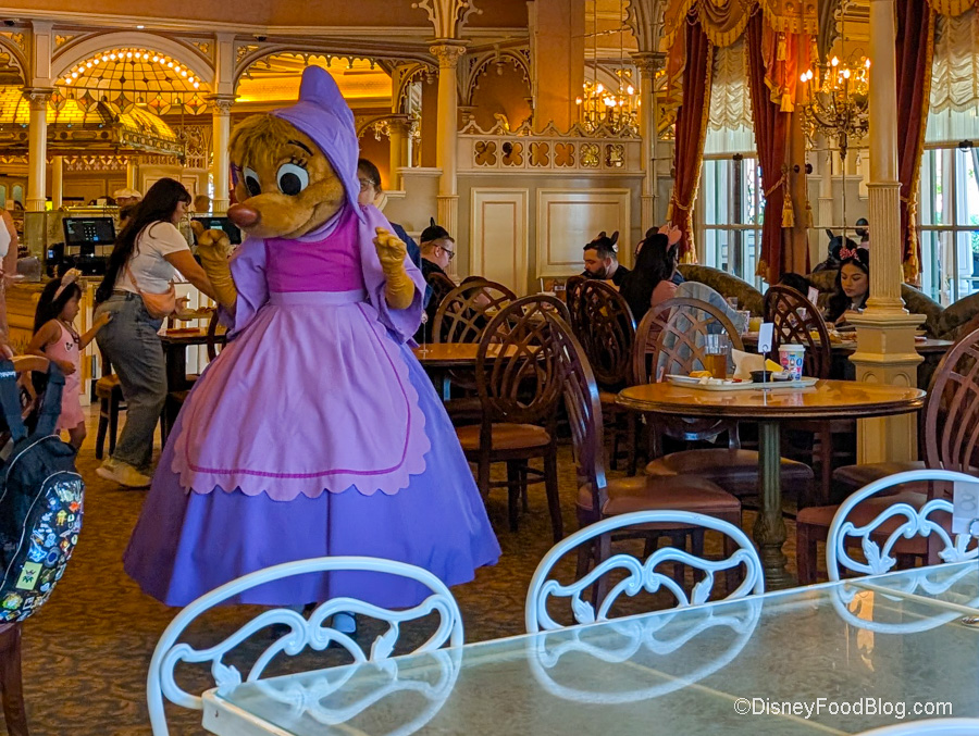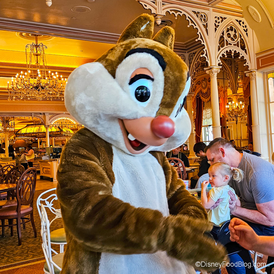 We barely had a chance to sit down before some characters came up to our table and we got our first of many interactions. Like I said, these characters can be random, so we were surprised to see some rare characters like Perla and Suzy, two of the mice from Cinderella. We also saw Pooh, Tigger, Chip, Dale, Pluto, and Daisy Duck. And they came to our table multiple times.