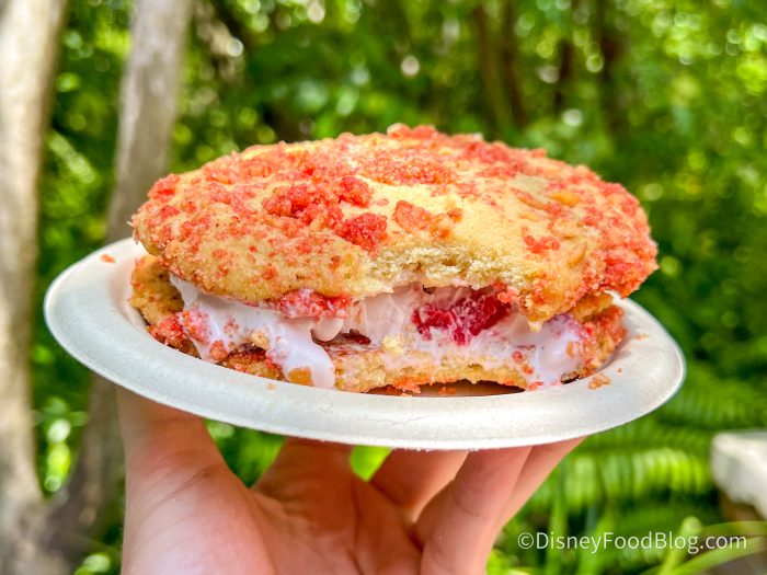 It melted FAST, but that’s okay because we also wanted to eat it fast! The ice cream had chunks of strawberries inside for a bite, and the outside cookies were incredibly soft. Because the cookies are plain sugar cookies, they help balance out the strawberry flavors and create an incredible bite. It’s definitely strawberry forward but not overwhelming!