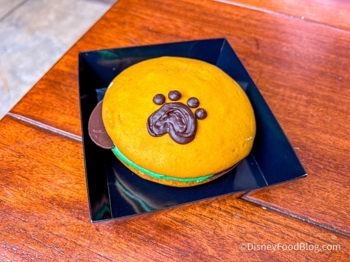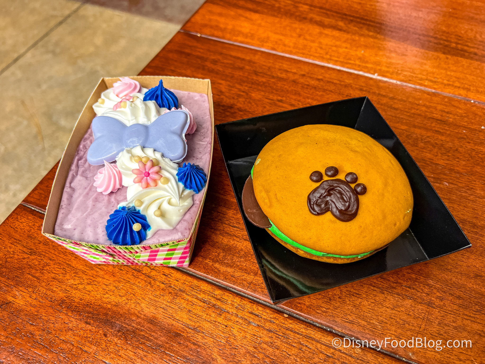 We recently made a trip to the Grand Hall Cart in the Grand Californian in Disneyland to try out two treats on the menu: the Pluto Whoopie Pie for $10 and the Daisy Cake for $14.