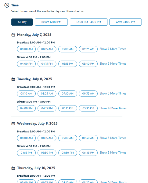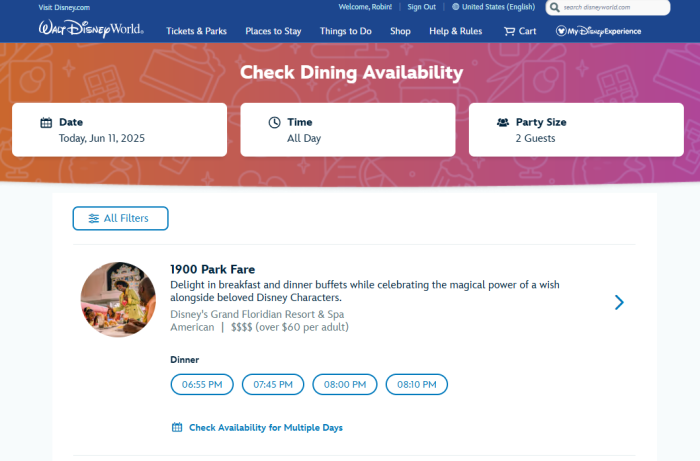 All you have to do is start on the Disney World or Disneyland dining page on the website. You can either search by restaurant or search for ALL availability. There are also filters you can use to choose restaurant type and more. If you choose “Check all Availability,” you’ll need to enter your party size and a specific date, but then you’ll get a list of all restaurants with availability and you can click on “Check Availability for multiple days.”