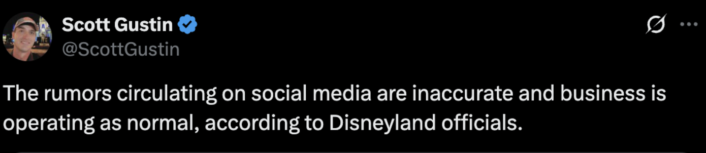 Scott Gustin also confirmed that Disneyland officials reported the online rumors as inaccurate and that business is operating as normal around the resort. The Anaheim Police Department also reported the rumor as false.