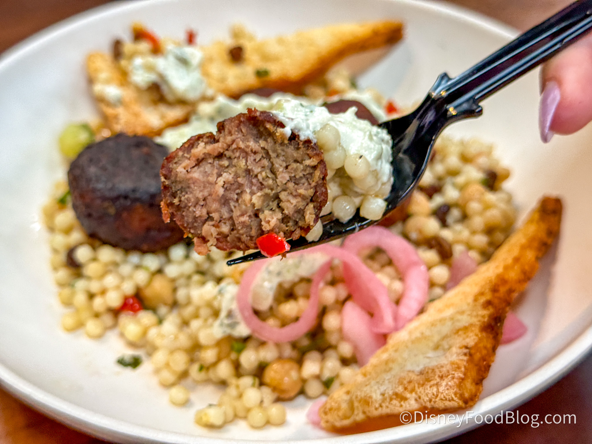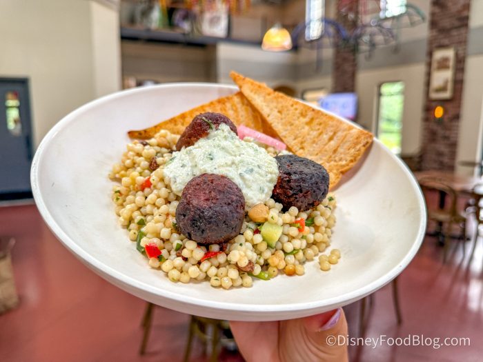 Then we grabbed the Mediterranean Meatball Bowl for $12.79. The bowl is filled with harissa-spiced Impossible meatballs, couscous salad, tzatziki sauce, pickled onions, and cauliflower pita crisps.