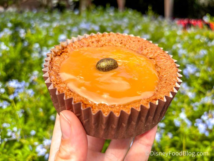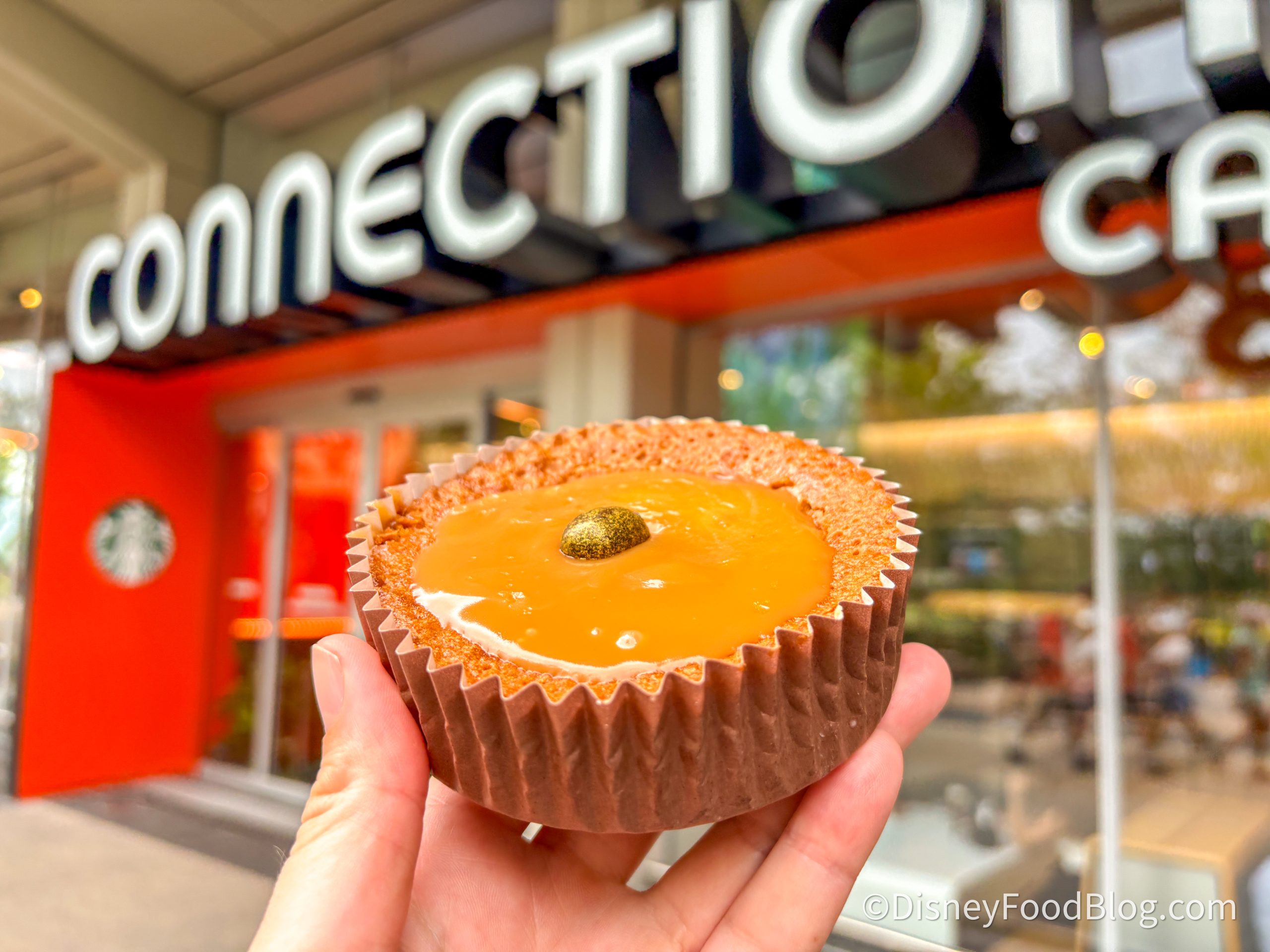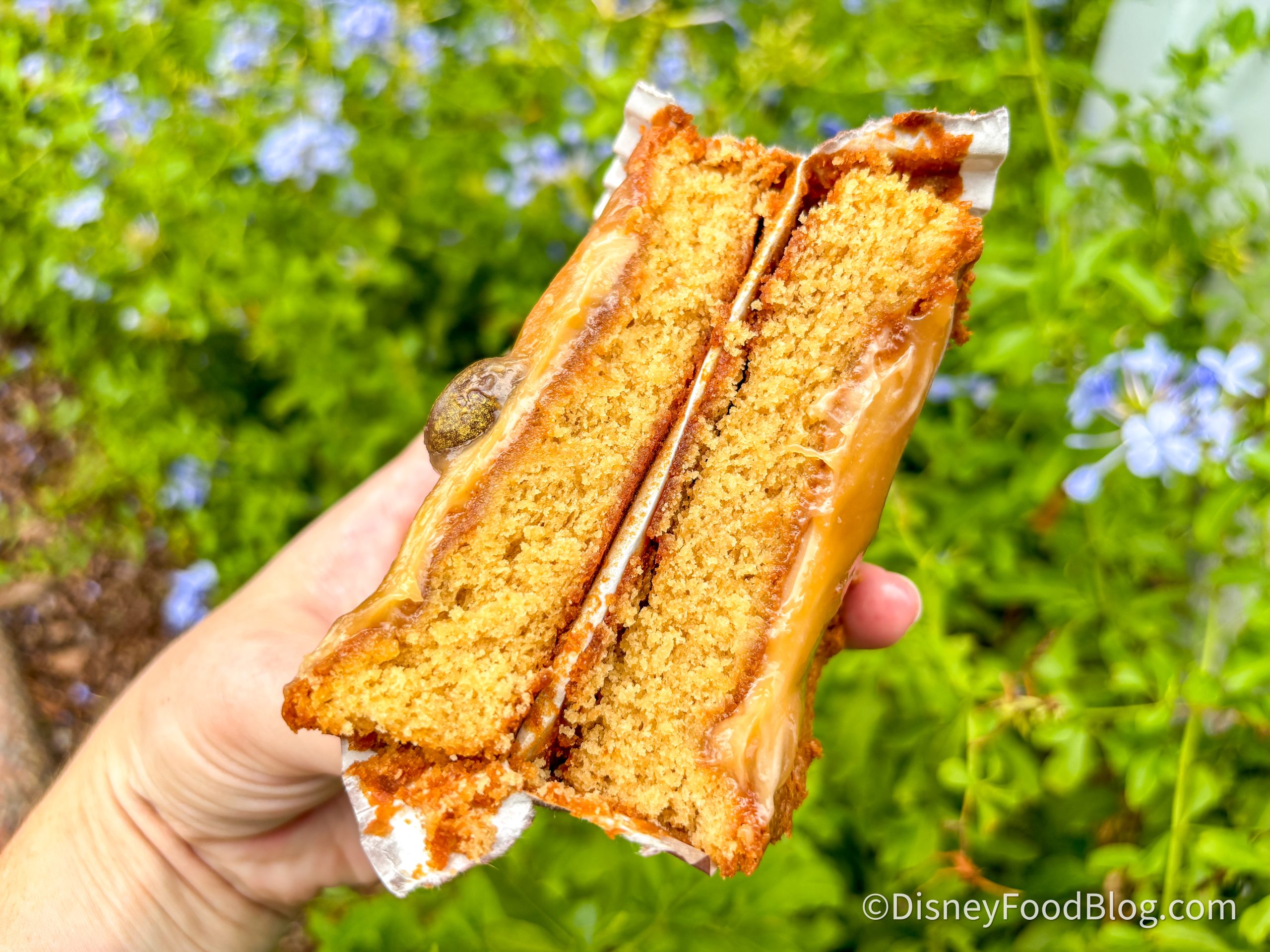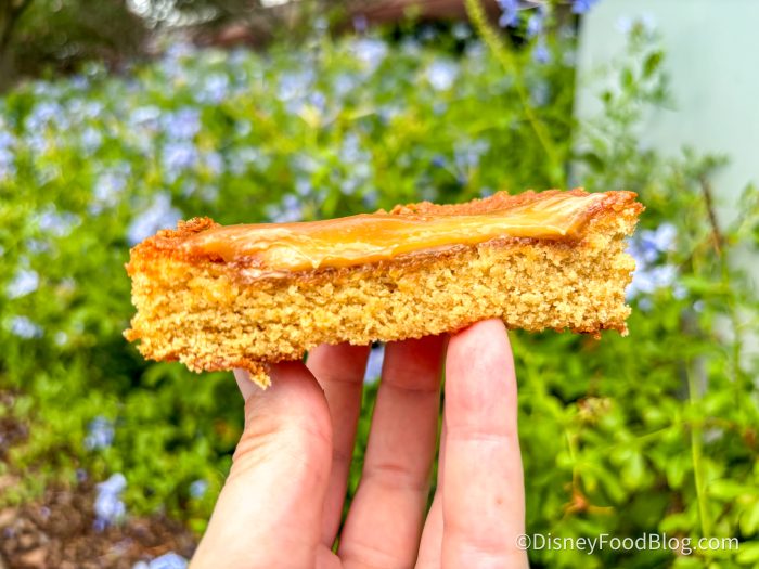 The Caramel Macchiato Blondie has debuted at Connections Cafe, and, of course, we had to try it out. While it is just displayed as a Blondie, a Cast Member let us know that it is technically called a Caramel Macchiato Blondie. You can get this treat for $5.29. Connections Cafe is the Starbucks in EPCOT, and it is on the other side of Connections Eatery, so you can also grab your favorite drink while getting this sweet treat!
