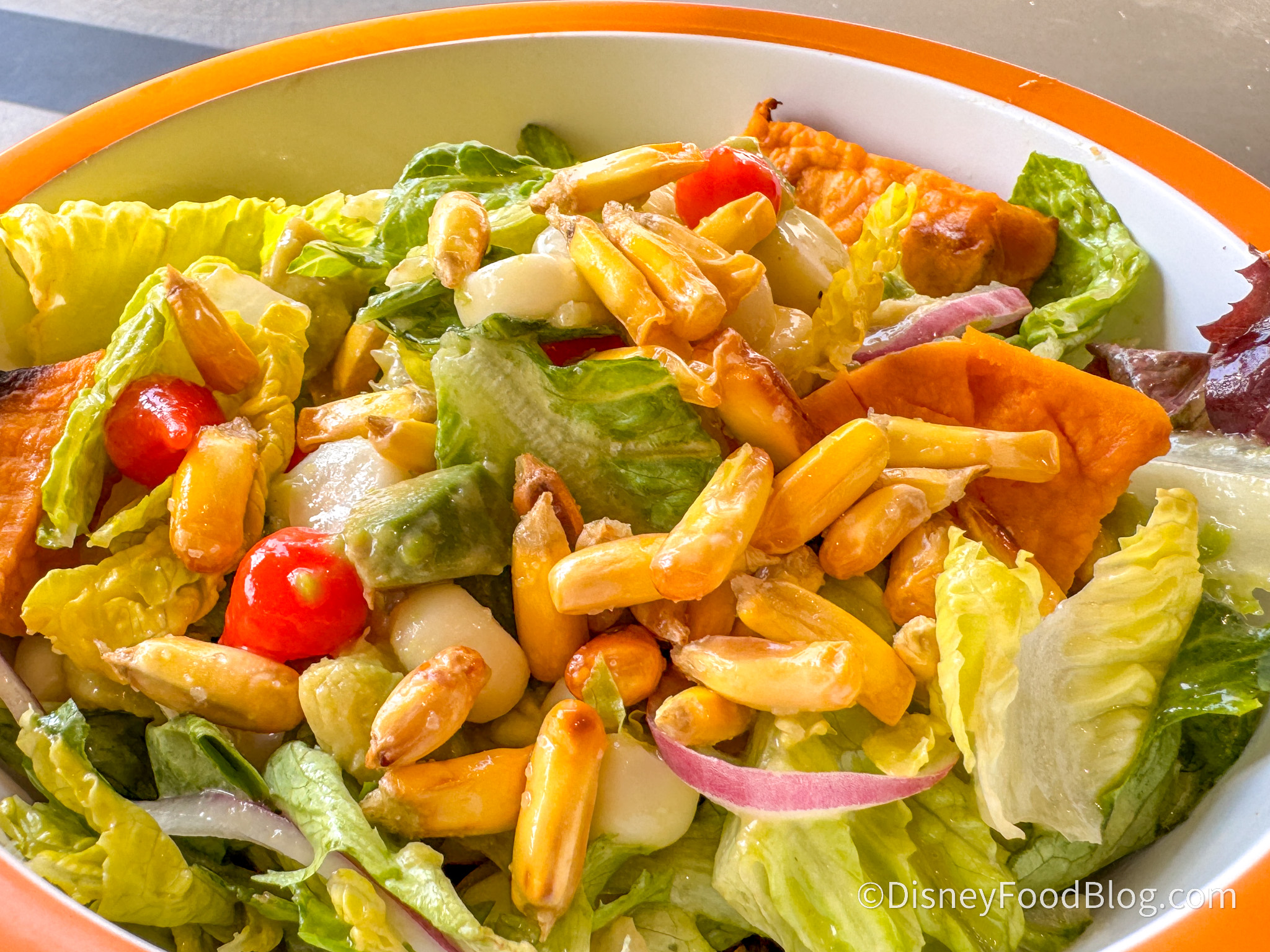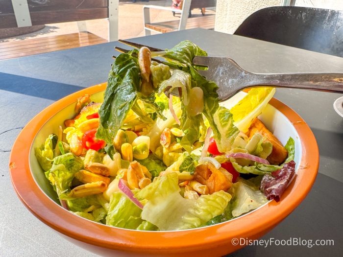 One of the highlights was the sweety drop peppers, which were small teardrop-shaped and burst when you bite into them. They were bright and fresh, really bringing the whole dish together texturally. We loved the spiced vinaigrette, which was slightly sweet and felt light and summery. Sometimes it can be difficult to find a lighter dish at Disney World, and we’re going to be keeping this salad in our lists when we need something to freshen our palates.