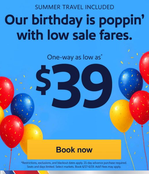 For a SUPER limited time, Southwest Airlines is offering flights as low as $39 one way. There are some important things to know about this sale, so before you hop on the deal, make sure you know all the rules and restrictions. We don’t want anyone crying on Southwest’s birthday, after all!