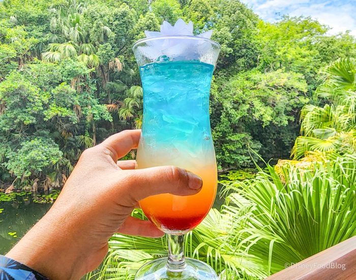 We stopped by Nomad Lounge at Animal Kingdom to grab the limited-time Tropical Rainbow Cocktail! This drink is around during June for Pride Month, and it’s essentially a Tropical Long Island, layered to represent the colors of the Pride Flag.