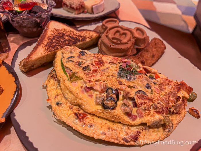 Since it’s a buffet, you pay one set price per person and then dig in as you so choose. For breakfast, it costs $55 per adult, plus tax and gratuity (which is already included in the bill). Kids cost $33 per child (3-9), plus tax and gratuity. First up, I tried the Create-Your-Own Omelet Station! There’s a whole bunch of toppings you can get thrown in, and I got the works except for jalapeños and chorizo.